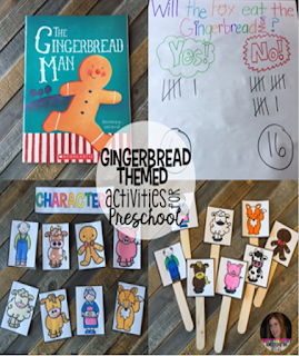 To start our week we read the book The Gingerbread Man by Gail Yerrill. I like this version, because there are not as many characters and the illustrations are amazing. We worked on predicting with a quick little survey. No matter the age I think it is important to work on book handling skills. We are always looking at the characters, parts of the story, problems and solutions. At least once a week I like to do an activity that builds on comprehension. Story puppets are an easy fun way.